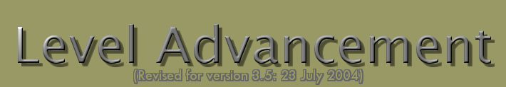 Advancement in this campaign is an expensive endeavor, typically costing the character a considerable amount of money. Once a character has accumulated enough experience points to advance a level, she/he must seek out a teacher/instructor or school which is willing to school him/her in the skills necessary to advance a level. Under most circumstances, the cost of advancement is borne by the character, and the sum can be considerable at higher levels. The cost of training and amount of time required to train, is dependent on three factors: