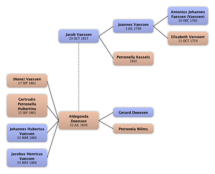 Jacob Vaessen Joannes Vaessen Antonius Johannes Faessen (Vaessen) Elisabeth Vervoort Petronella Kessels Aldegonda Doensen Gerard Doensen Petronela Wilms (None) Vaessen Gertrudis Petronella Hubertina Johannes Hubertus Vaessen Jacobus Henricus Vaessen