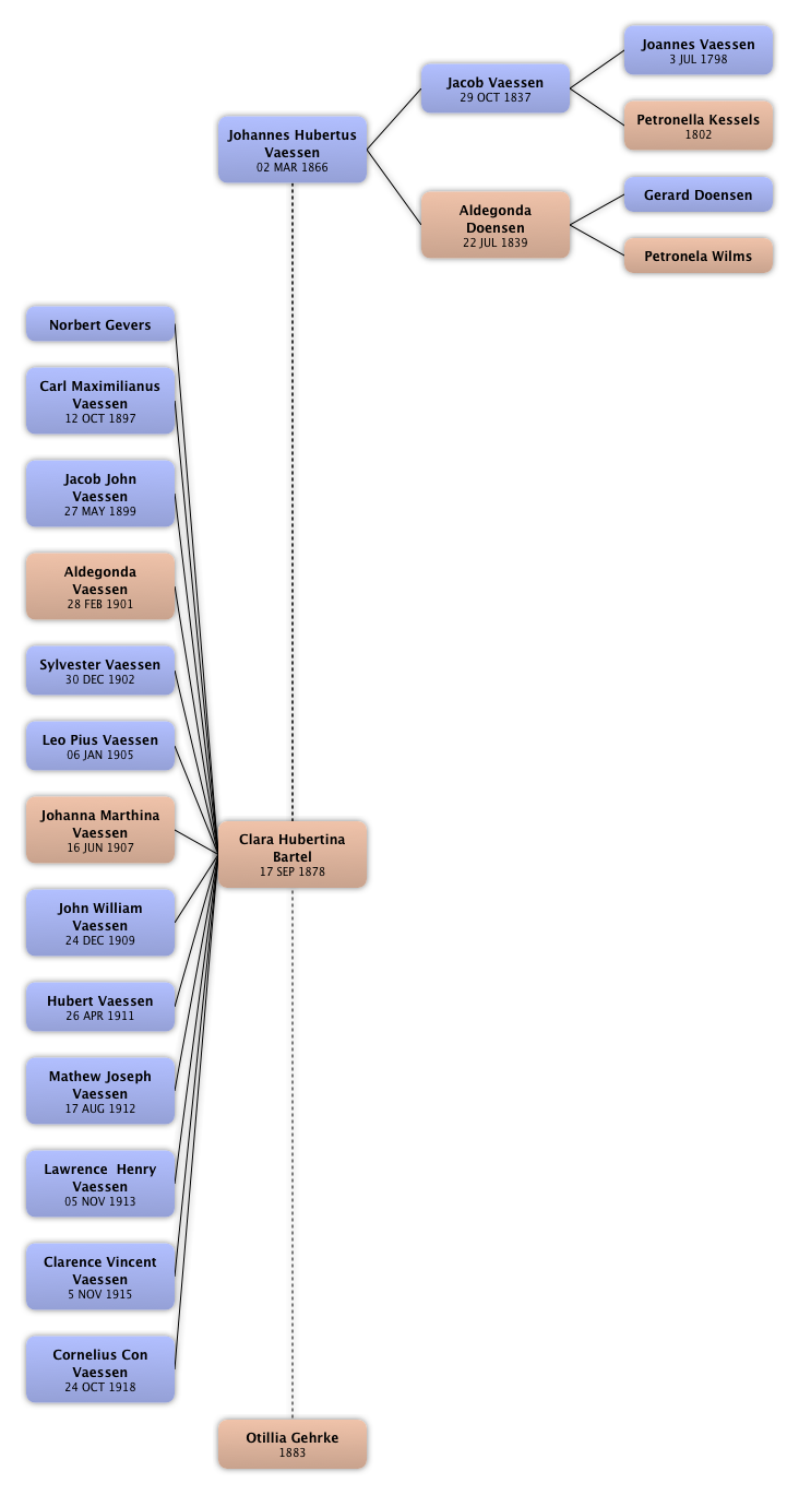 Johannes Hubertus Vaessen Jacob Vaessen Joannes Vaessen Petronella Kessels Aldegonda Doensen Gerard Doensen Petronela Wilms Clara Hubertina Bartel Norbert Gevers Carl Maximilianus Vaessen Jacob John Vaessen Aldegonda Vaessen Sylvester Vaessen Leo Pius Vaessen Johanna Marthina Vaessen John William Vaessen Hubert Vaessen Mathew Joseph Vaessen Lawrence  Henry Vaessen Clarence Vincent Vaessen Cornelius Con Vaessen Otillia Gehrke