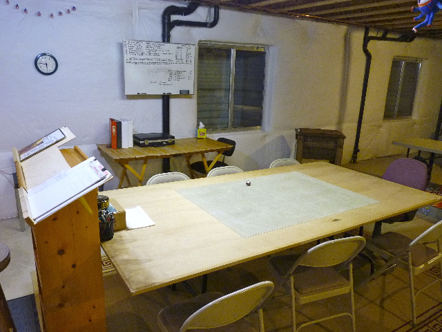 Here you can see some essential tools of the trade. The tackle box (full of dice and such), a bookshelf (full of books), an overhead projector for drawings and maps.