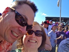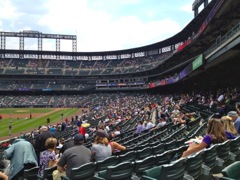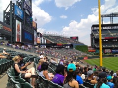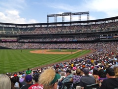 The seats weren't the best, but the price was right. At $14.00 apiece Tim did a good job getting us some discounted seats. The seats were in one of the sections with no shade. Luckily there was plenty of cloud cover (an atypical day in Denver), so we didn't get too burnt by the sun. I broke out the sun screen and lathered up. For some reason, Kim said she'd be fine. She didn't use the sun screen - Yes, she paid for that decision later.