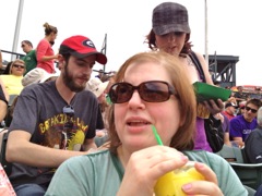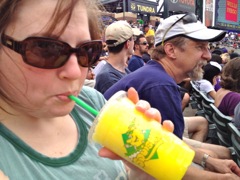 Since we just had lunch, we weren't all that hungry. We didn't have any food while we watched the game, but we did have some drinks. I only had one beer (A 16oz Coors in a 'Cone Top' style aluminum can), Kim had a big lemon 'Squishy', and we both had a 'Snow-Ball' to cool off towards the end of the game. Of course everything was way over-priced. We should have brought some of our own food and drinks (which is permitted at Coors Field). The service was spotty at best. If you really wanted something to eat or drink, you had to leave your seat. Either that or wait an hour or so before a vendor comes along...