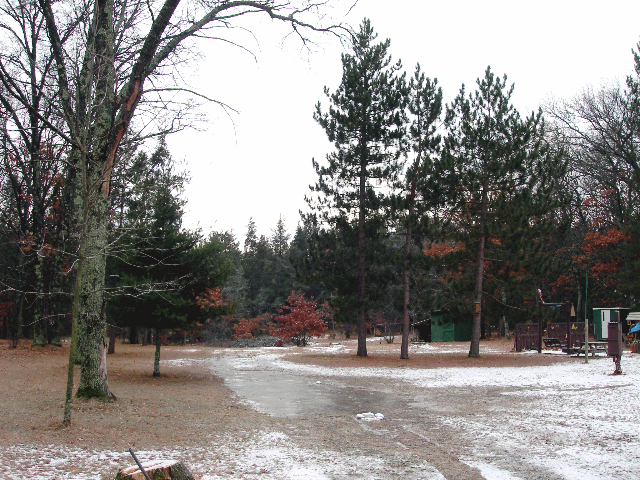 The backyard at my parent's place. Firepit, Shiver shack, pines and oak.