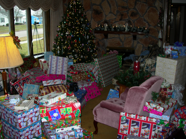 More gifts than you can shake a stick at. I counted more than 200 packages!