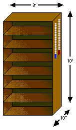 A wooden bookshelf with dimensions of 10' high, 8' wide, and 10" deep. There are seven shelves upon which books may be placed. The bookshelf has two chains w/tassles on the end, attached to the right side of the bookshelf. One tassle is blue, the other red. When the blue tassle is