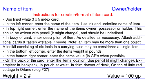 item. (you can write on the back if you need some extra space, or stapple an extra card to the back). There's much more room on a 3 x 5 card, than a single line on a character sheet.