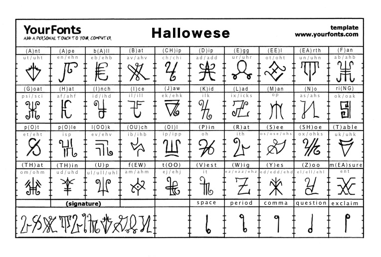 Some technical details: As far as artificial languages go, Hallowese is something of an oddity. It wasn't created as a communications method so much as it was meant to add flavor to a theatrical presentation (see above for more details on the origin of Hallowese). Because of it's nature, Hallowese in practice is a transliterative language. One would write a phrase in his/her native language, and then convert that into Hallowese. The result could be spoken and/or written (in Hallowese). English to Hallowese transliterations would of course differ from a German to Hallowese conversion. The written and spoken results would be completely different. Keep in mind that Hallowese was created as a pronounceable transliterative language. In other words; The translation process should be based on pronunciation of the words in question. Translation could be performed intuitively, or by formalized pronunciation methodology. I use the intuitive method myself. It's far quicker, less complicated, and doesn't require a degree in linguistics. Transliteration from pronounced english words into Hallowese doesn't have to be complicated. Simply sound out the words in their native language (provided it's not something consisting of clicks, hisses, and other guttural utterings), and select the Hallowese characters that correspond to the appropriate sounds. The result will be a Hallowese character string. That character string can then be pronounced by grouping together the accumulated sounds of the formed words. Since I originally posted this web page, I've noticed a marked interest by universities and students of linguistics. I've even noticed that Hallowese has been included in the curriculum of some university linguistic programs. While it wasn't my intention to create a true artificial language with technically formalized rules, I am surprised by the level of interest. I will provide feedback and update this web page as necessary, in order to help those who are 'studying' this 'language'.